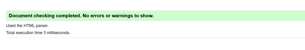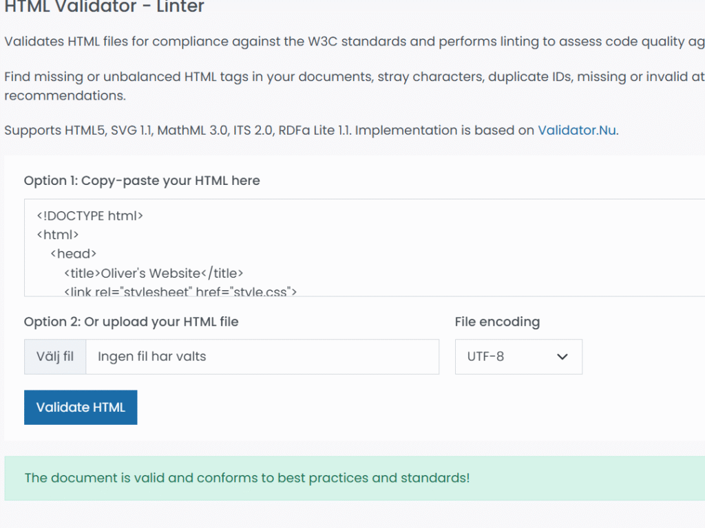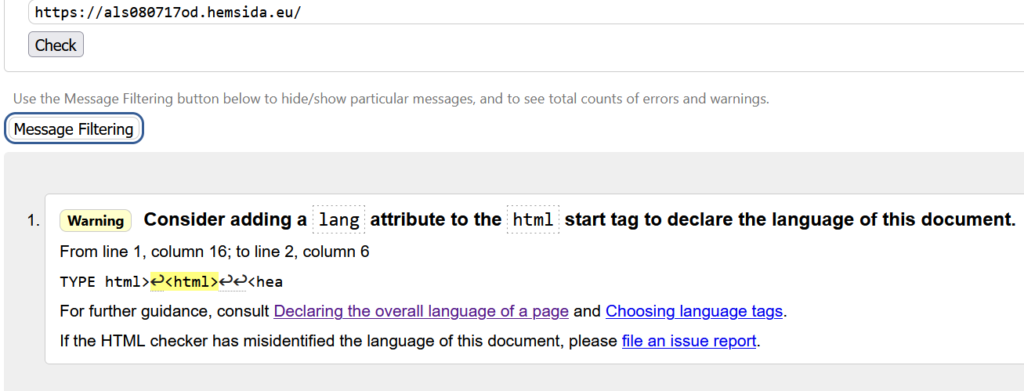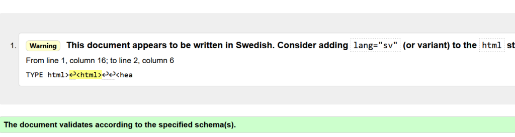 På bilden under har jag validerat HTML koden, allt funkar men jag fick en varning för att jag inte har ställt in språket på sidan.