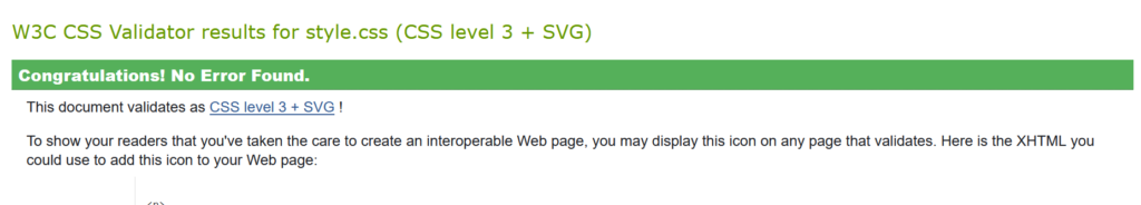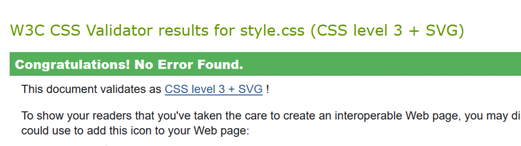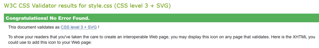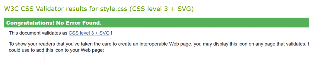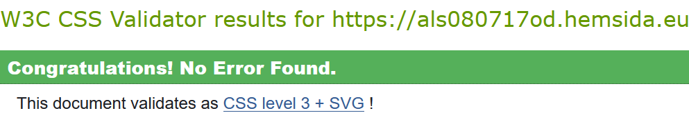 Jag har även validerat HTML och CSS. Jag fick byta ut section element mot div för att det skulle valideras rätt för det fanns ingen header till section. Jag hade även av misstag satt <html lang=”en”> när det igentligen ska vara <html lang=”sv”>, så där fick jag även en varning men det är fixat nu.