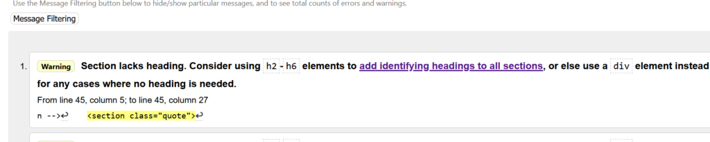 The validation service gave me 4 warnings about not using a header when using the section semantic element. This could be fixed relatively quickly if you change the section element to a div element. But this removes the use of the semantic element and reduces clarity and benefits of semantic elements. Therefore I chose to keep the section element.