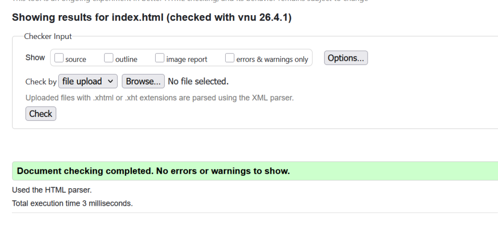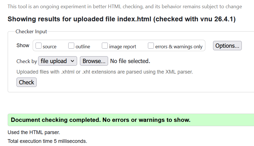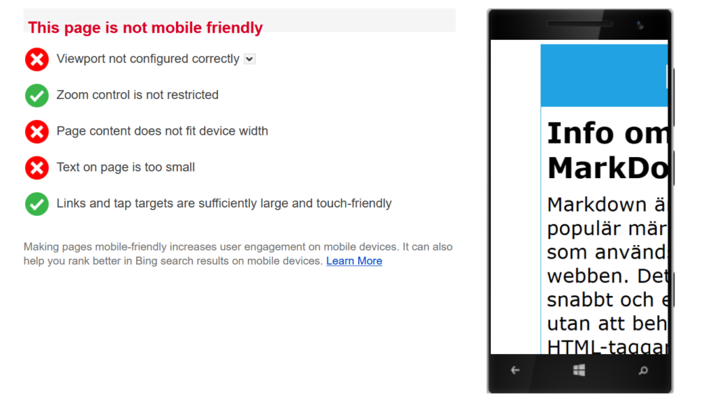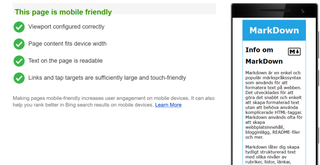Allt validerade korrekt vilket är bra men det betyder inte att sidan fungerar lika bra på alla enheter såsom mobiler. Nu ska jag testa Bings mobilvänlighetsverktyg.