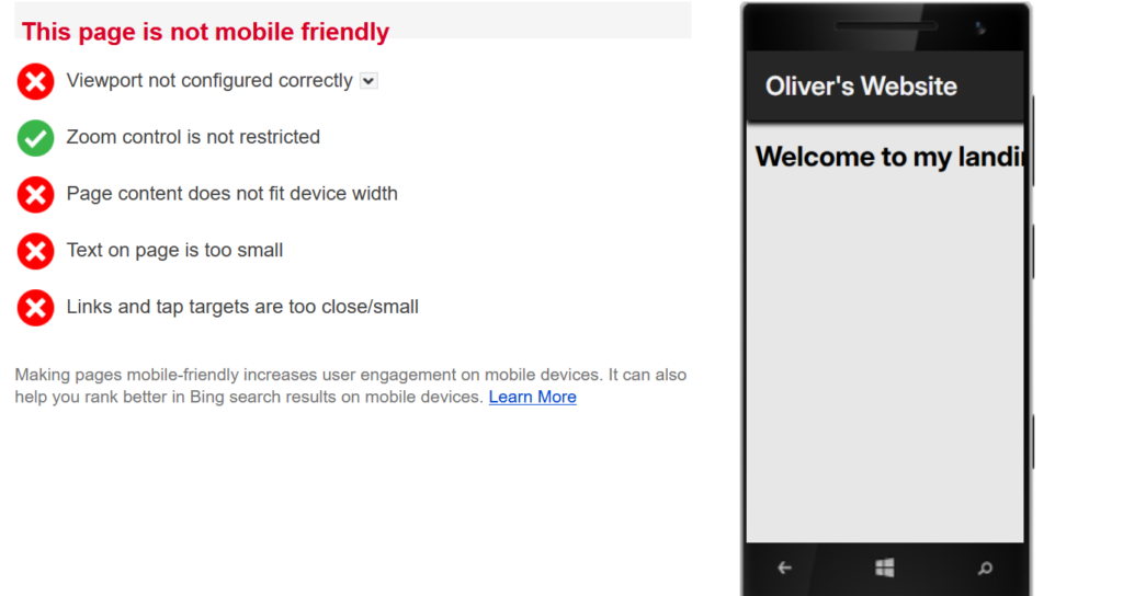 Nu tänkte jag validera koden för sidan samt kolla hur mobilvänlig sidan verkligen är via Bings mobilvänlighets test.